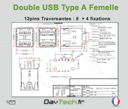 Connecteur Double USB Type A 12 (8+4) pins Traversantes