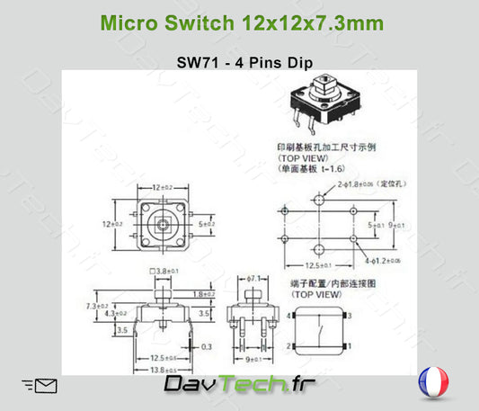 Micro switch 12x12x7.3mm 4 pins DiP bouton poussoir push
