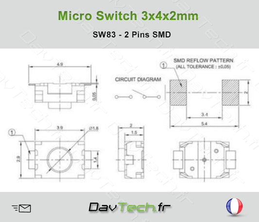 Micro switch 3x4x2mm 2 pins SMD bouton poussoir push button interrupteur