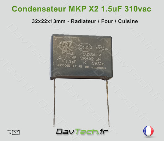 Condensateur MKP X2 - 1,5uF - 310V - 32 x 22 x 13mm (L x l x p)