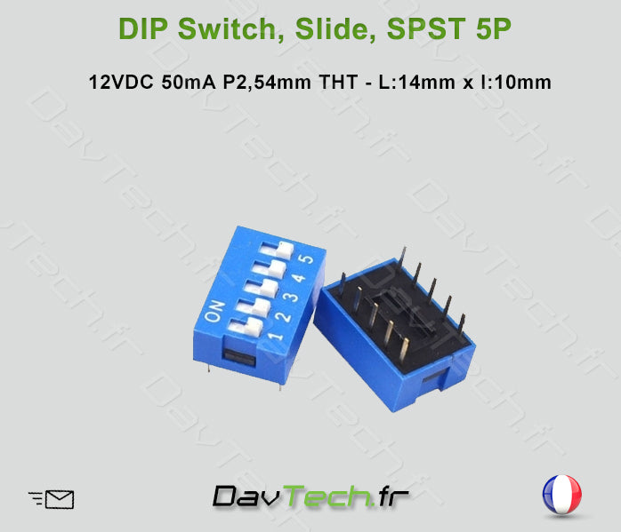 Dip switch 5 Positions interrupteur, 10pins, SPST, Pas 2.54mm, 12VDC 50mA